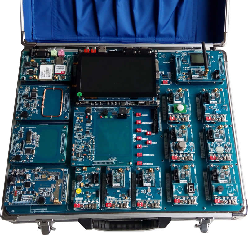 Cortex-A8内核高端的多功能物联网教学产品,包含7个ZigBee节点模块(每个节点集成多传感器、包含15种类传感器单元、7种控制器单元)、Bluetooth4.0模块、1个GPRS模块、5个RFID模块(125k、14443、15693、UHF900M、有源RFID)。