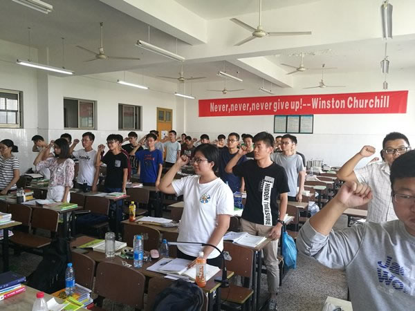 最后,同学们举起右手,握紧拳头,一起宣誓:“一百天,我将拼出青春无悔,一百天,我将笑吟四年的等待,百炼成钢,百日流芳,打造人生新篇章。”