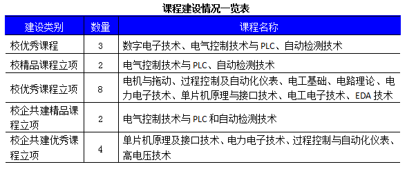 课程建设是保证人才培养方案顺利实施和提高教学质量的重要环节,自动化学院以学校精品课程、优秀课程为切入点,吸收和应用最新的教学研究成果和科研成果,进行课程内容的优化、整合、提炼与更新,获批校优秀课程3门,立项建设精品课程2门、优秀课程8门;立项建设校企共建课程6门,其中精品课程2门;“电气控制技术与PLC”、“电机与拖动”多媒体课件分获省教育厅二等奖。依托课程建设,公开出版《电工技术基础》、《单片机原理及应用》、《电力电子技术》等教材10部,其中省重点建设教材1部。