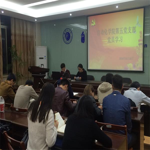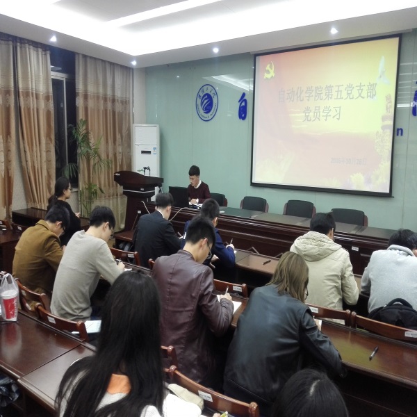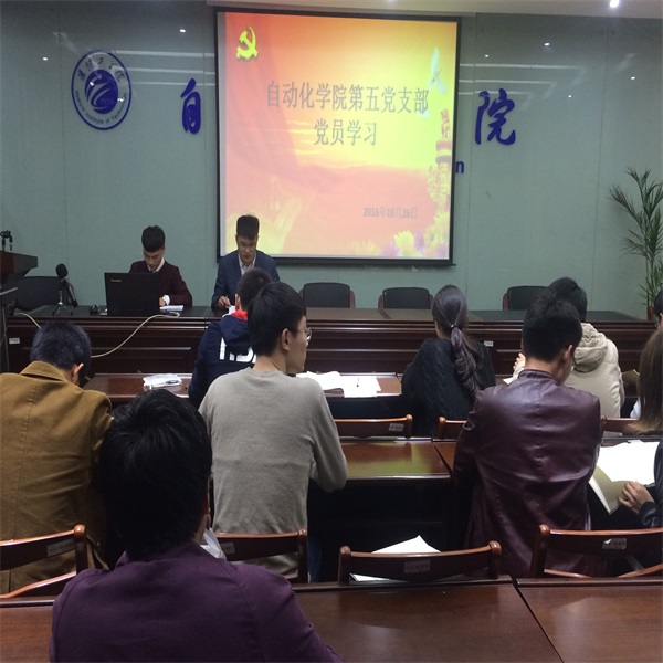 2016年10月26日,自动化学院第五党支部全体党员在笃行楼509党员活动室一起学习了党章、习总书记系列讲话。支部书记蔡熙文带领大家重温入党誓词,牢记党员义务、党的全心全意为人民服务的宗旨。