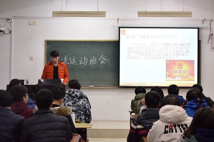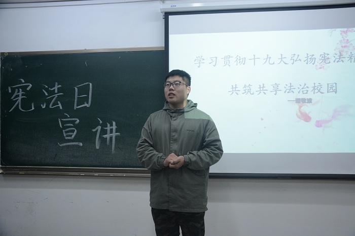 为了让同学们更加了解宪法的意义及内涵,培养同学们遵纪守法的良好品性, 11日晚八点半,自动化学院在大一晚自习教室开展宪法日宣讲活动。自动化学院学生会外联部部长谢敬波、体育部部长施旺、自律委员会部长林玉杰、心理部部长许志文、金色阳光志愿者队队长孙晋尧分别到各个班级进行宣讲。