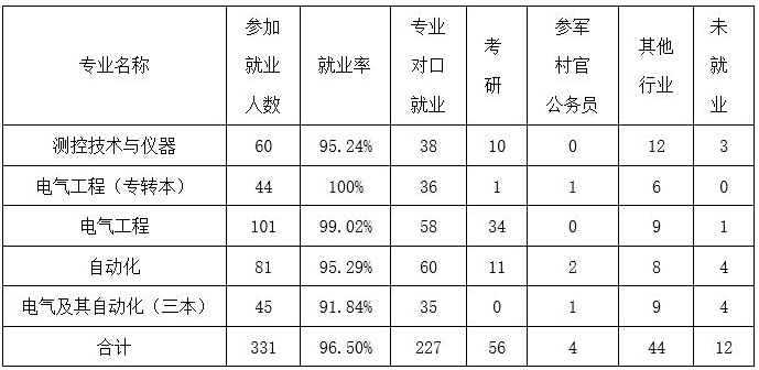 2016年我院本科毕业生参加就业人数为343名,截至2016年底就业率为96.50%。其中1人参加江苏省选调生的选拔被录取,2人被录取为村官,56人考取研究生,考研录取率达22%,再创新高,电气工程及其自动化专业考研录取率33.33% ,取得了阶段性成绩!各专业毕业生就业情况如下: