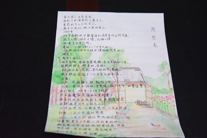 我院组织部组织学生干部担任本次评委,采用投票计分的方式选出了优秀奖。整个过程由组织部部长监督,实现了公开化公平化。最后决胜出的三幅作品分别是周恩来总理的素描和关于恩来精神的书法还有手抄赞颂恩来精神的诗作。